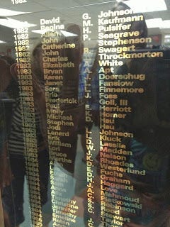 18 National Merit Finalists from our class recorded in the academic trophy case just off the cafeteria: