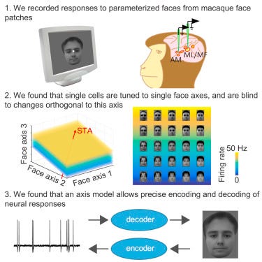 Primates recognize complex objects such as faces with remarkable speed and reliability. Here, we reveal the brain’s code for facial identity. Experiments in macaques demonstrate an extraordinarily simple transformation between faces and responses of cells in face patches. By formatting faces as points in a high-dimensional linear space, we discovered that each face cell’s firing rate is proportional to the projection of an incoming face stimulus onto a single axis in this space, allowing a face cell ensemble to encode the location of any face in the space. Using this code, we could precisely decode faces from neural population responses and predict neural firing rates to faces. Furthermore, this code disavows the long-standing assumption that face cells encode specific facial identities, confirmed by engineering faces with drastically different appearance that elicited identical responses in single face cells. Our work suggests that other objects could be encoded by analogous metric coordinate systems. 200 cells is interesting because (IIRC) standard deep learning face recognition packages right now use a 126-dimensional feature space. These packages perform roughly as well as humans (or perhaps a bit better?).