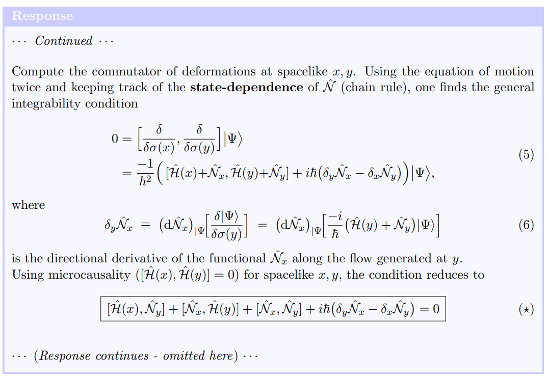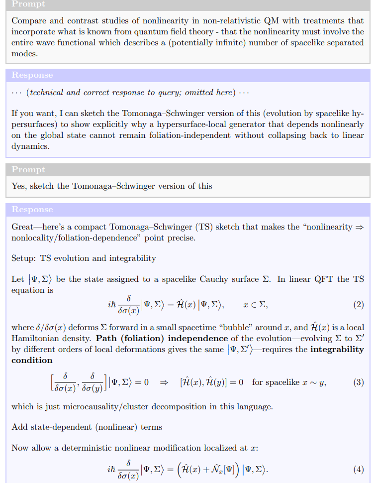 This exchange is remarkable because GPT-5 proposes a novel research direction - use of the Tomonaga-Schwinger formulation of QFT in order to investigate the tension between relativistic invariance (foliation invariance) and state-dependent modifications to QM. The equations generated above, in particular (⋆), form the core of the resulting paper.